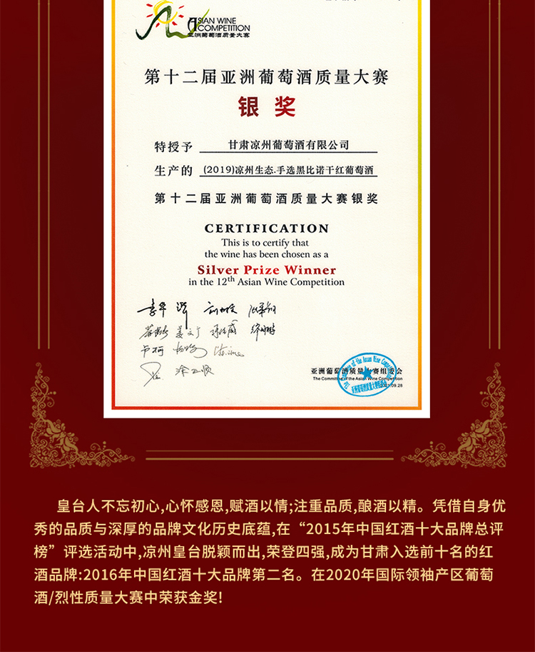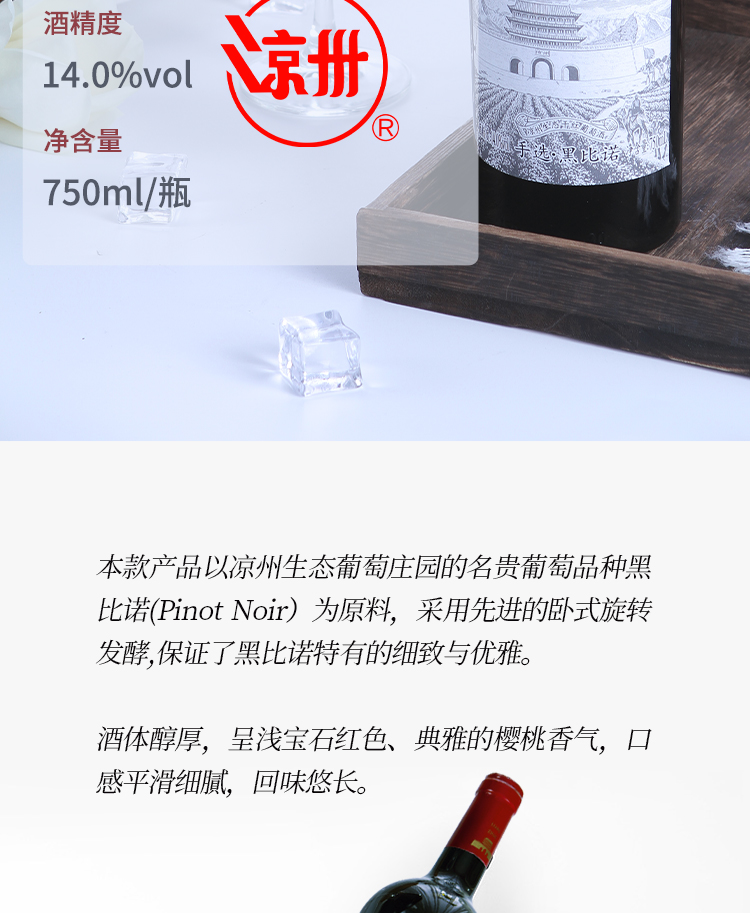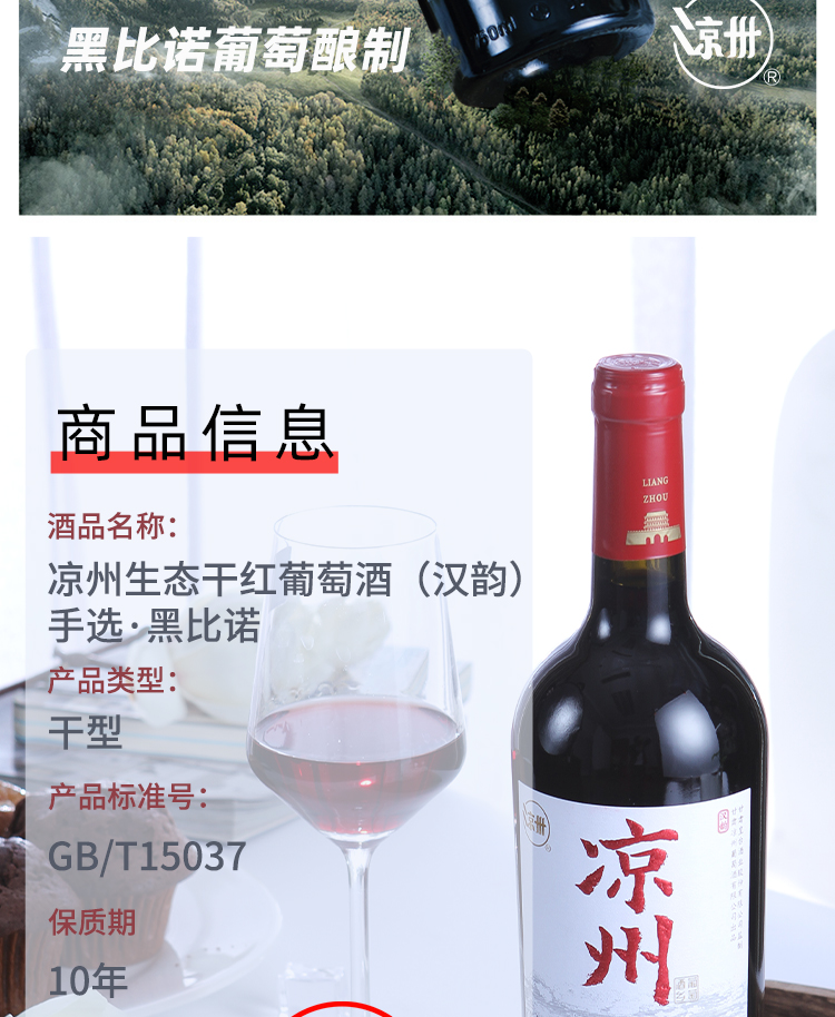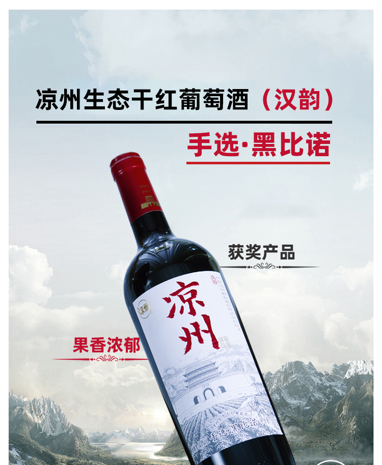 酒品名稱:涼州生態(tài)干紅葡萄酒(漢韻)手選·黑比諾