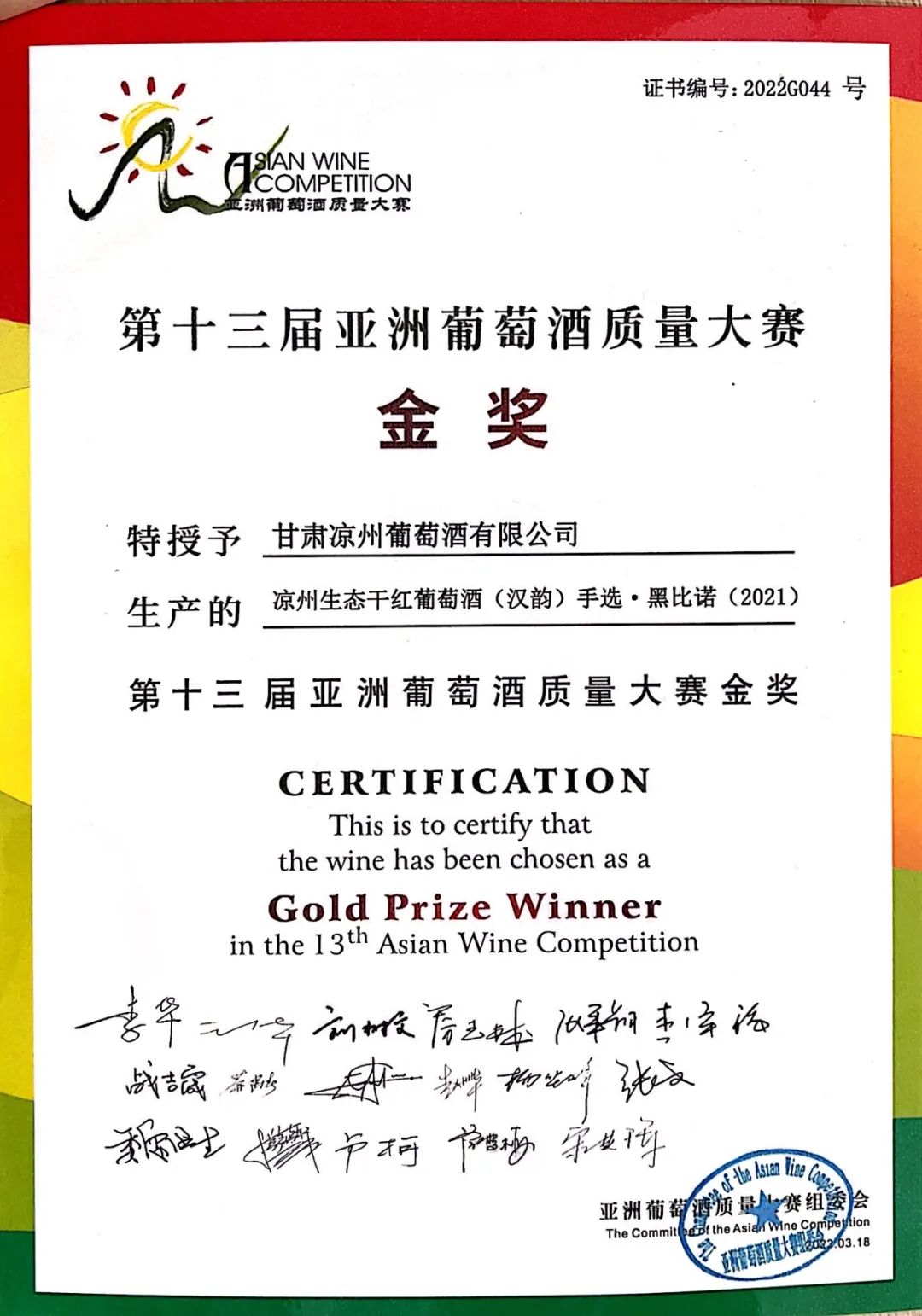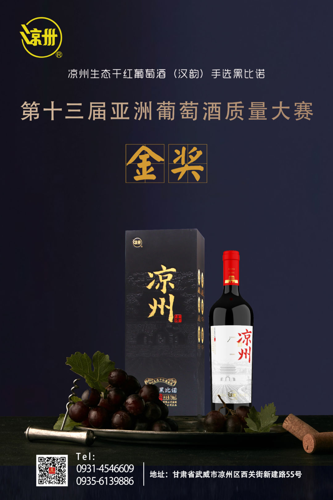 近日,皇臺酒業(yè)旗下子公司甘肅涼州葡萄酒有限公司生產(chǎn)的涼州生態(tài)干紅葡萄酒在第十三屆(2022)AWC亞洲葡萄酒質(zhì)量大賽上再獲佳績,涼州生態(tài)干紅葡萄酒(漢韻) 手選·黑比諾 (2021)榮獲金獎,涼州生態(tài)千白葡萄酒(漢彩)手選·貴人香 (2021)榮獲銀獎。