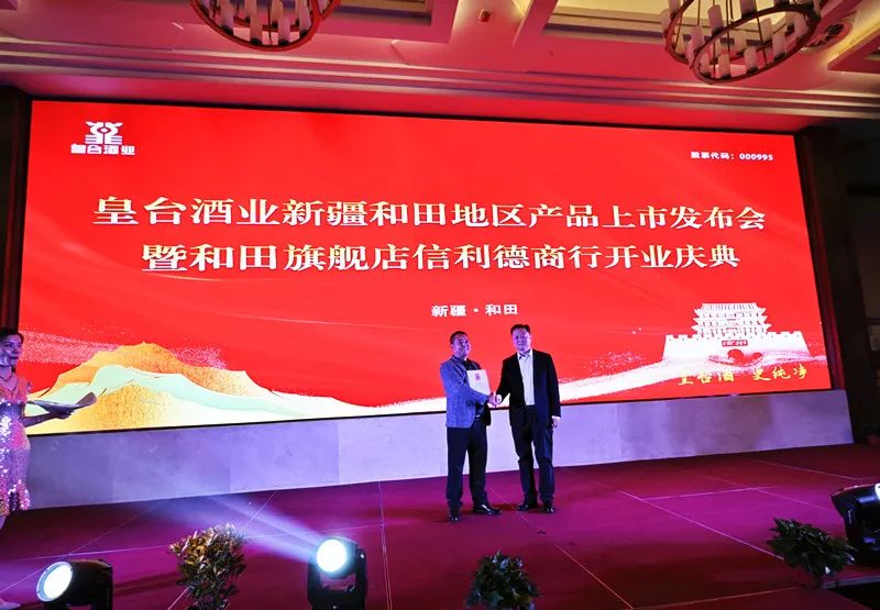 甘肅日新皇臺(tái)酒銷售有限公司總經(jīng)理辛秀山為皇臺(tái)酒業(yè)和田旗艦店信利德商行袁國(guó)新頒發(fā)經(jīng)銷授權(quán)書